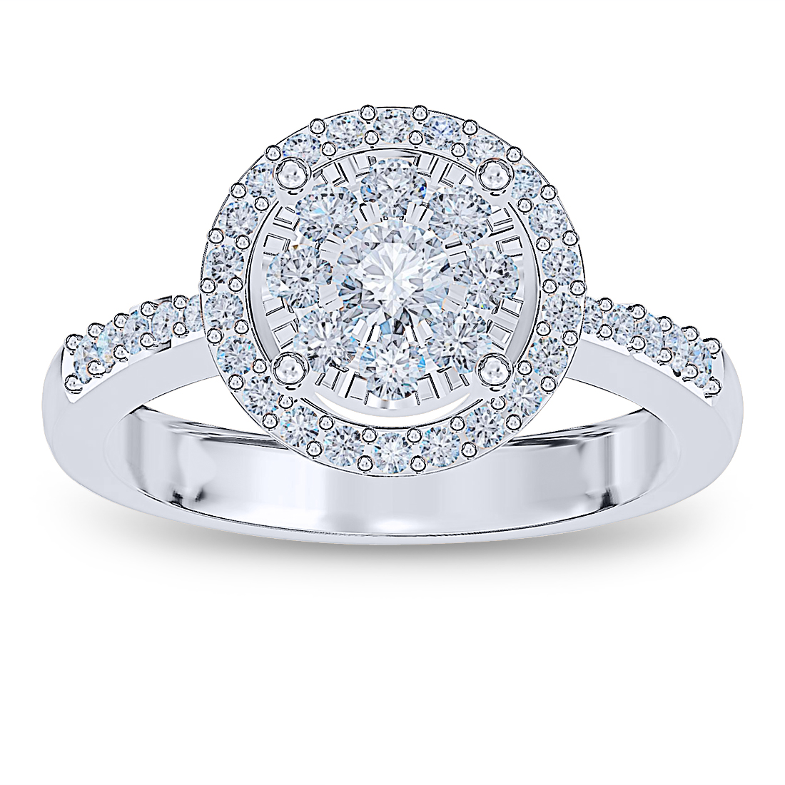 Inspired by the delicate Cairica flower, a round diamond blooms at the centre of a halo of eight mini-diamonds — a timeless symbol of elegance and love.